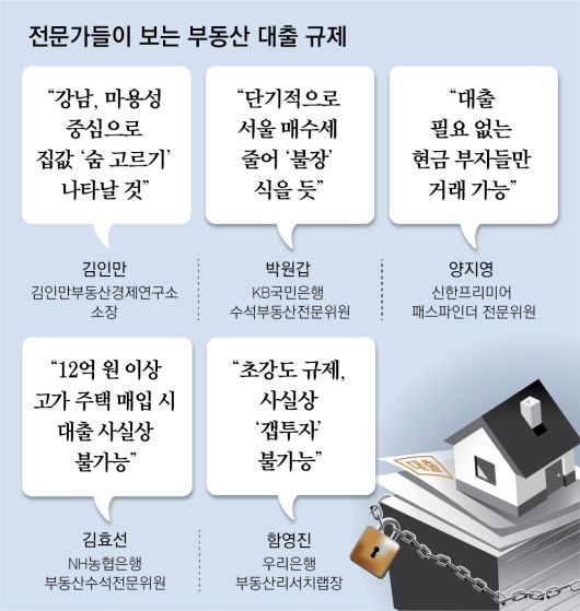 박원갑 KB국민은행 수석부동산전문위원은 “이번 규제는 강남과 ‘마용성’(마포, 용산, 성동구)을 타깃으로 한 것으로 보인다”며 “대출을 많이 받아야 하는 주택일수록 영향이 클 것이고, ‘똘똘한 한 채’ 열풍이 주춤하며 ‘숨 고르기’ 장세로 진입할 것”이라고 전망했다. 함영진 우리은행 부동산리서치랩장은 “수도권에서 6억 원 이상 대출을 못 받게 하는 건 전례 없는 내용”이라며 “서울 마포·성동 등 한강벨트 라인의 과열을 진정시키는 효과가 있을 것”이라고 예상했다.