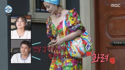 이떄 박나래는 화려한 꽃무늬 점프수트를 입고 머리에는 두건을 둘렀다.