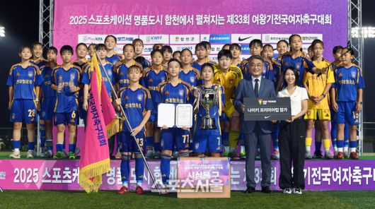 울산 현대청운중 선수들이 27일 경남 합천에서 열린 ‘2025 스포츠케이션 명품도시 합천에서 펼쳐지는 제33회 여왕기 전국여자축구대회’ 중등부 시상식에서 우승을 차지한 뒤 시상자인 한국여자축구연맹 양명석 회장, 나이키 서가희 팀장과 기념촬영을 있다. 현대청운중은 결승에서 경북 포항항도중에 3-0 승리를 거두며 여왕기 우승을 차지했다. 2025. 6. 27.