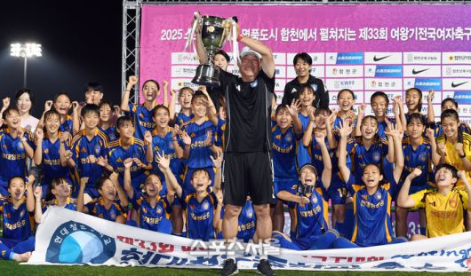 울산 현대청운중 김광석 감독이 27일 경남 합천에서 열린 ‘2025 스포츠케이션 명품도시 합천에서 펼쳐지는 제33회 여왕기 전국여자축구대회’ 중등부 시상식에서 우승 트로피를 들어올리며 기뻐하고 있다. 현대청운중은 결승에서 경북 포항항도중에 3-0 승리를 거두며 여왕기 우승을 차지했다. 2025. 6. 27.