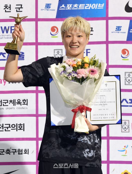 세종 고려대 골키퍼 박어진이 27일 경남 합천에서 열린 ‘2025 스포츠케이션 명품도시 합천에서 펼쳐지는 제33회 여왕기 전국여자축구대회’ 대학부 시상식에서 GK상을 수상한 뒤 기념촬영을 하고 있다. 2025. 6. 27.합천 | 박진업 기자 upandup@sportsseoul.com [기사제보 news@sportsseoul.com] Copyright ⓒ 스포츠서울&sportsseoul.com