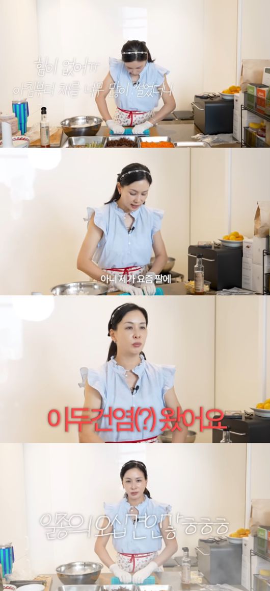 재료 준비를 완료하고 김밥을 말던 고소영이 "아침부터 채를 너무 많이 썰었더니 힘이 없다. 제가 요즘 팔에 이두건염이 왔다"라고 말했다. 이어 그는 "일종의 오십견인가? 편집해달라"라고 말해 웃음을 자아냈다.