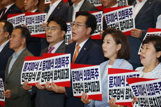 국민의힘은 소속 의원 전원은 국회 본회의장 좌석에 ‘중립포기 국회의장 국민들이 분노한다’, ‘묻지마식 의회폭주 민주당식 협치파괴’ 손피켓을 붙이며 반발한 뒤 본회의가 열리자 전원 퇴장했다. 이후 국회에서 규탄대회를 진행했다.