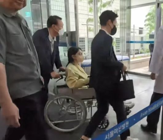 특별검사팀 출범을 앞두고 우울증 등 지병을 이유로 입원했던 김건희 여사가 27일 서울 송파구 서울아산병원에서 윤석열 전 대통령이 미는 휠체어에 탄 채 퇴원하고 있다. SBS·MBC·KBS·YTN·MBN 방송 풀 제공 |