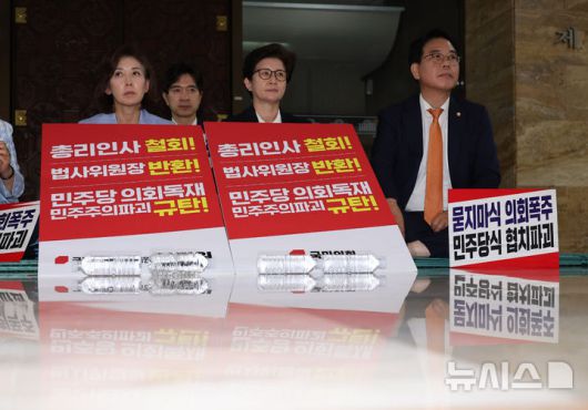 [서울=뉴시스] 정윤아 기자 = 국민의힘이 더불어민주당의 김민석 국무총리 후보자 인준안 강행 처리 방침과 국회 법제사법위원장·예산결산특별위원장 선출 강행에 반발하며 전방위적인 공세에 나섰다. 국민의힘은 여대야소 국면에서 민주당이 국회 주요 요직을 사실상 독점하려 한다며 견제 장치가 사라진 일방통행 국회로 전락할 우려가 크다고 반발했다.