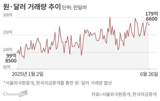 최근 들어 대내외 불확실성이 커지면서 환율 변동성이 커진 것도 한몫했다. 환율이 빠르게 움직이면 차익실현을 노리는 투자자들의 달러 거래량이 늘어난다. 박수연 메리츠증권 연구원은 “5월 초 미국-대만 환율협상 여파로 대만달러가 강세를 보일 때 원화 가치도 덩달아 상승했다”면서 “이때 달러 저가 매수 수요가 쏠리면서 거래량이 늘어난 것으로 보인다”고 했다.