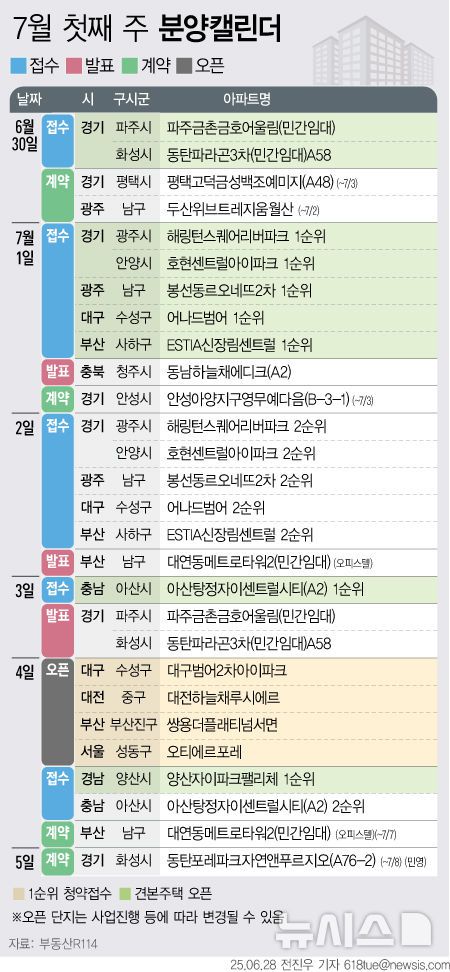 [서울=뉴시스]정진형 기자 = 부동산R114는 7월 첫째 주 전국 9개 단지 총 6475가구가 분양을 시작한다고 28일 밝혔다. 이 중 일반분양은 3809가구 규모다.