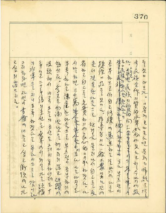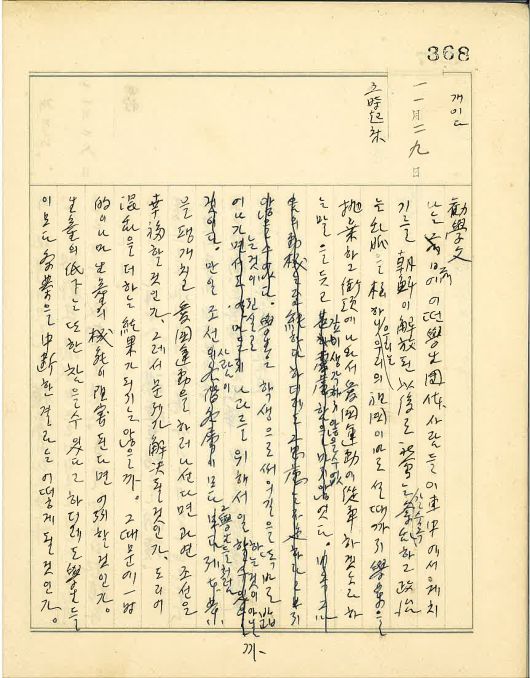 진실로 조국의 광복과 동포의 행복을 염원할진대 학생은 물론이어니와 농민이거나 노동자이거나 정치가이거나 간에 모두들 제 맡은 일을 성실하게 해가는 한편 틈 있는 대로 부지런히 공부하라. 아버지와 어머니와 아들과 딸들이 모두 한자리에 모여서 가갸거겨를 외워라. 그리고 한글을 깨친 사람은 또 높은 계단을 밟아 올라가라. 그리하여 서책을 통하여 고금의 선각(先覺)들에게서 인생의 바른 길을 배우고 조국 재건의 옳은 방략을 들으라.