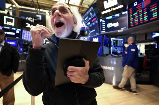 뉴욕증권거래소에서 트레이더가 환호하고 있다. (사진=AFP) |