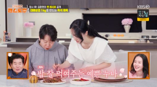 이날 이정현은 직접 만든 홍갓물김치와 함께 삼겹살, 고사리 구이를 남편 입에 넣어줬다. 이를 본 이연복은 “자기도 손이 있는데 왜 먹여주냐”라고 했고, 김준현은 “평소에도 먹여주냐”라고 물었다. 계속해서 남편에 밥을 먹여주는 자신의 모습에 이정현도 깜짝 놀란듯 “처음 알았다. 내가 이렇게 먹여주는 구나”라고 생소한 반응을 보였다.