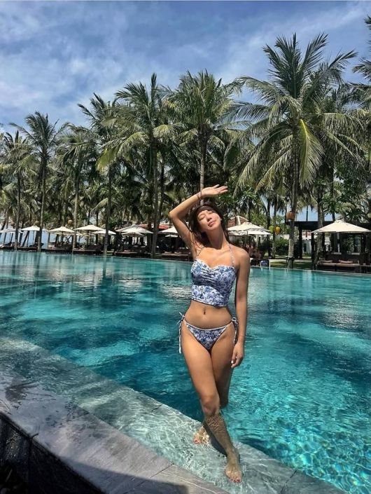 배경은 베트남 호이안, 청량한 하늘과 수영장이 펼쳐진 럭셔리 리조트. 하지만 시선을 먼저 끈 건 김희정의 여름룩이었다.