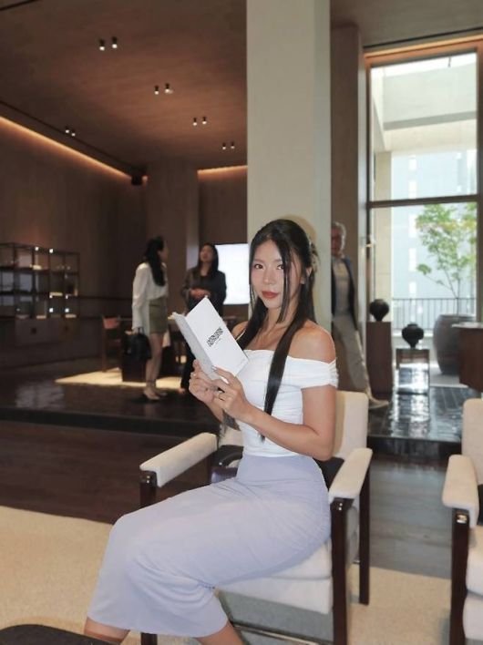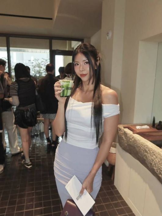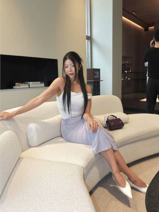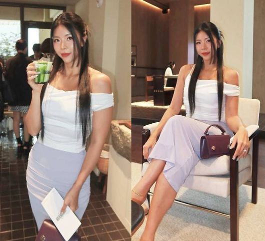 제이제이는 깔끔한 화이트 오프숄더 톱으로 쇄골과 데콜테 라인을 강조했다. 허리를 부드럽게 감싸는 실루엣은 바디라인을 자연스럽게 강조했고, 하의로 매치한 라벤더 컬러 머메이드 스커트는 전체 룩에 우아한 흐름을 더했다. 여기에 화이트 힐과 와인 컬러의 미니백을 포인트로 더하며 청순하면서도 세련된 무드를 완성했다.