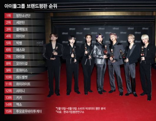 방탄소년단은 지난 4월부터 이달까지 3개월 연속 아이돌그룹 브랜드평판 1위를 차지하고 있다. 특히 이달 방탄소년단의 브랜드평판지수는 지난 4월과 5월에 비해 각각 1.3%, 4% 가량 높게 나타났는데 멤버 7명 전원이 이른바 '군백기'(군 복무 공백기)를 마치고 완전체로 돌아온 것에 대한 기대감이 투영된 것으로 보인다.