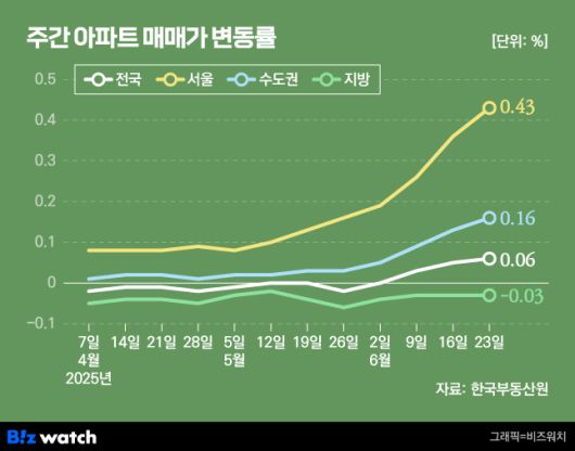 한국부동산원은 6월 넷째주(23일 기준) 서울 주간 아파트 매매가격이 전주 대비 0.43% 올랐다고 분석했어요. 일주일 전 상승률(0.36%)과 비교하면 0.07%포인트 높아진 상승률이에요. 2018년 9월 둘째주(0.46%) 이후 최고라네요.