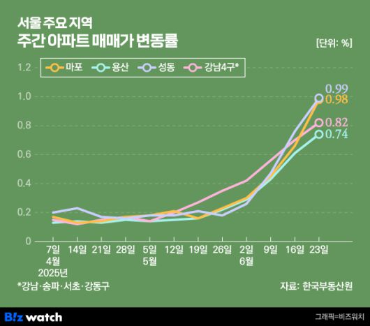 서울 마포구와 성동구의 주간 아파트값 상승률이 역대 최고치를 찍었어요. 한 주 동안 1% 가까이 올랐대요. 토지거래허가구역(토허구역)으로 묶여 거래에 제약이 있는 강남3구(강남·서초·송파)와 용산구도 지난주보다 상승폭을 더욱 키웠고요.