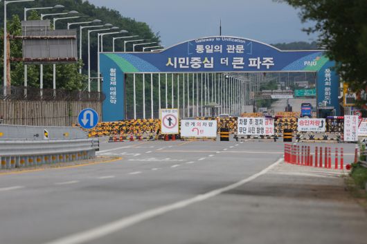 정부가 민간단체의 북한 주민 접촉을 허용하고 있는 가운데 26일 경기도 파주시 통일대교 남단 경의선 도로에서 차량이 오가고 있다. [연합] |