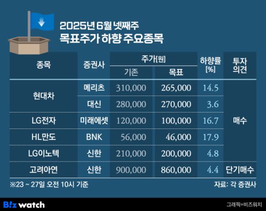 대신증권도 현대차 목표가를 28만원에서 27만원으로 낮췄다. 김귀연 연구원은 "미국의 25% 관세율 부과에 따라 올해 영업이익 추정치를 기존 대비 17%, 내년도 영업이익 추정치를 37% 각각 하향 조정했다"고 말했다.