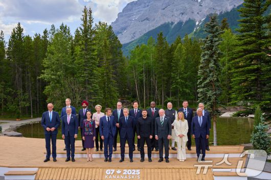 이재명 대통령이 17일(현지시각) 캐나다 앨버타주 캐내내스키스 주요 7개국(G7) 정상회의장에서 G7 및 초청국 정상들과 기념촬영을 하고 있다. (이재명 대통령 SNS. 재판매 및 DB 금지) 2025.6.19/뉴스1 ⓒ News1 박지혜 기자 |