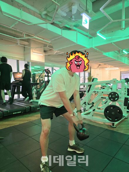 왼팔 손목에는 갤럭시워치7, 오른팔 손목에는 애플워치를 착용하고 캐틀벨 운동을 하고 있다(사진=윤정훈 기자) |