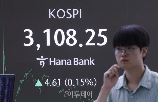 코스피가 상승하며 3100선 강보합으로 마감한 25일 서울 중구 하나은행 딜링룸 전광판에 코스피가 표시돼 있다. 이날 코스피는 전 거래일보다 4.61(0.15%) 포인트 상승한 3108.25를 나타냈다. 조현호 기자 hyunho@ |