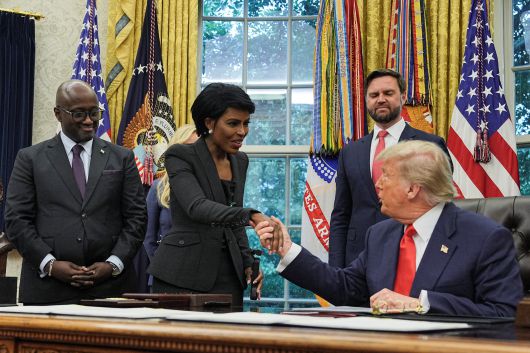 도널드 트럼프 미국 대통령은 27일 백악관 행사에서 자신의 오른편에 서 있던 한 여기자를 향해 이렇게 말했다. 이날 오후 오벌 오피스에선 미국의 중재 아래 테레즈 카이쾀바 와그너 콩고민주공화국(DRC) 외무장관과 올리비에 은두훈기레해 르완다 외무장관이 30년에 걸친 유혈 분쟁을 끝내는 평화협정을 체결했다. 트럼프가 “아름답다” “당신과 같은 사람이 더 많았으면 좋겠다”며 칭찬을 쏟아낸 여성은 민주콩고 출신으로 백악관을 취재하고 있는 여기자 하리아나 베라스였다.