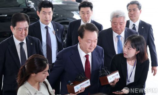 [서울=뉴스핌] 양윤모 기자 = 윤석열 전 대통령이 28일 오전 12·3 비상계엄과 관련한 내란·외환 사건을 수사하는 조은석 특별검사팀의 소환조사에 참석하기 위해 특검사무실인 서울고등검찰청에 출석하고 있다.이날 소환 조사에 윤 전 대통령 측에서는 김홍일,송진호,채명성 변호사가 입회했다. [공동취재] 2025.06.28 yym58@newspim.com