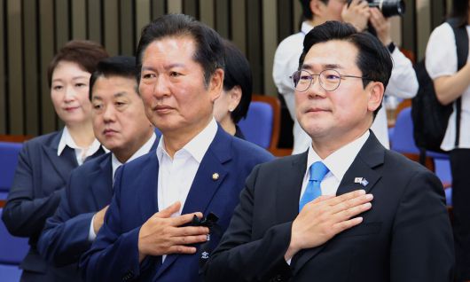더불어민주당 당대표 출마를 선언한 정청래(왼쪽), 박찬대 의원이 24일 서울 여의도 국회에서 열린 의원총회에서 국민의례를 하고 있다. 뉴시스 |