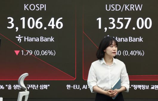 26일 오전 서울 중구 하나은행 본점 딜링룸 현황판에 코스피, 원/달러 환율이 표시돼 있다. 이날 코스피는 전장보다 0.09p(0.00%) 오른 3108.34로 시작해 장 초반 3110선 부근에서 보합세를 보이고 있다. [사진출처 = 연합뉴스] |