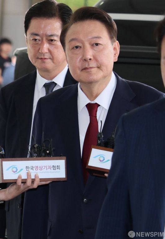 [서울=뉴스핌] 양윤모 기자 = 윤석열 전 대통령이 28일 오전 12·3 비상계엄과 관련한 내란·외환 사건을 수사하는 조은석 특별검사팀의 소환조사에 참석하기 위해 특검사무실인 서울고등검찰청에 출석하고 있다.이날 소환 조사에 윤 전 대통령 측에서는 김홍일·채명성·송진호 변호사가 동행했다. [공동취재] 2025.06.28 yym58@newspim.com