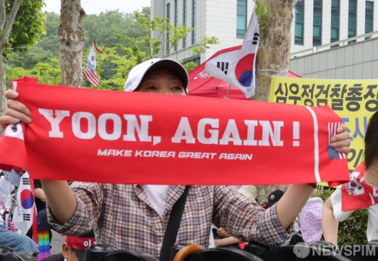 [서울=뉴스핌] 양윤모 기자 = 윤석열 전 대통령이 28일 12·3 비상계엄과 관련한 내란·외환 사건을 수사하는 조은석 특별검사팀의 소환조사에 참석하기 위해 특검사무실인 서울고등검찰청에 출석한 가운데, 윤 전대통령 지지자들이 집회를 하고 있다. 2025.06.28 yym58@newspim.com