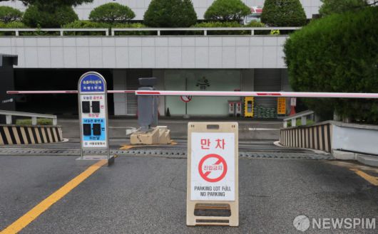 [서울=뉴스핌] 양윤모 기자 = 윤석열 전 대통령이 28일 오전 12·3 비상계엄과 관련한 내란·외환 사건을 수사하는 조은석 특별검사팀의 소환조사에 참석하기 위해 특검사무실인 서울고등검찰청에 출석예정인 가운데 지하 주차장 입구에 '만차' 안내판이 설치되어 있다. 2025.06.28 yym58@newspim.com