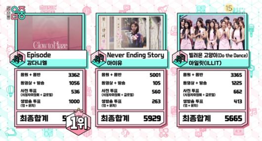 아일릿의 '빌려온 고양이'는 총점 5665점으로 3위, 아이유의 '네버 엔딩 스토리'(Never ending story)가 총점 5929점으로 2위를 차지했다.