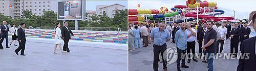 (서울=연합뉴스) 북한TV가 26일 원산갈마해안관광지구 준공식을 방영한 영상에 김정은 국무위원장이 야외물놀이장을 주애와 함께 관람하려 도착하자 이를 지켜보던 외국인들이 김위원장을 보려고 두리번 거리고 있는 모습이 북한 방송에 소개돼 이목을 끈다. [조선중앙TV 화면] 2025.6.28