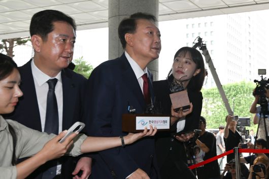 특검이 출석을 요구한 시각인 오전 10시보다 5분 이른 9시 55분께 서울고검에 도착한 윤 전 대통령은 취재진의 질문에는 일절 답하지 않고 서울고검 청사로 들어갔다.
