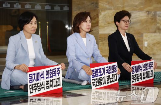 국민의힘 서명옥(왼쪽부터), 나경원, 강선영 의원이 27일 서울 여의도 국회 로텐더홀에서 김민석 국무총리 후보자의 지명 철회, 법제사법위원장 반환을 촉구하며 농성을 하고 있다. 2025.6.27/뉴스1 ⓒ News1 김민지 기자 |