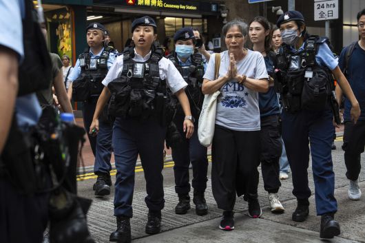 2025년 6월4일 홍콩 시내에서 열릴 예정이던 천안문(톈안먼) 사태 36주기 추모 집회에 참석하려다 경찰에 연행되는 활동가. 1990년부터 홍콩에서 매년 열리던 천안문 사태 추모 집회는 2020년 국가보안법이 제정되면서 금지됐다. 홍콩 경찰은 이날 집회 예상 지역에서 행인들을 검문해 집회 참가자들을 체포, 연행했다. AP 연합뉴스 |