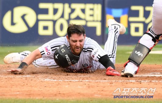 28일 잠실구장에서 열린 LG 트윈스와 KIA 타이거즈의 경기. 4회말 1사 2루 LG 문성주 안타 때 오스틴이 홈을 향해 몸을 날리고 있다. 잠실=박재만 기자 pjm@sportschosun.com/2025.06.28/