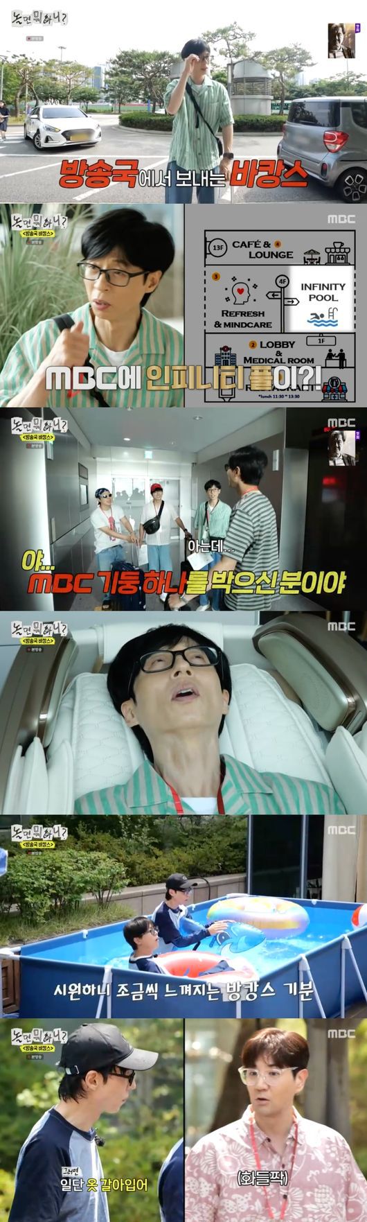 유재석은 불신하며 방송국 안으로 들어갔고, 안내데스크에서 체크인을 하고 로비 한켠에 마련된 쌍화탕과 인삼꿀차 웰컴드링크를 마시며 점차 바캉스에 몰입했다.