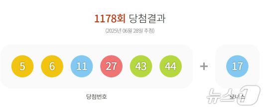 (서울=뉴스1) 김종훈 기자 = 28일 1178회 로또 1등 당첨 번호는 '5·6·11·27·43·44'로 결정됐다. 보너스 번호는 '17'이다.
