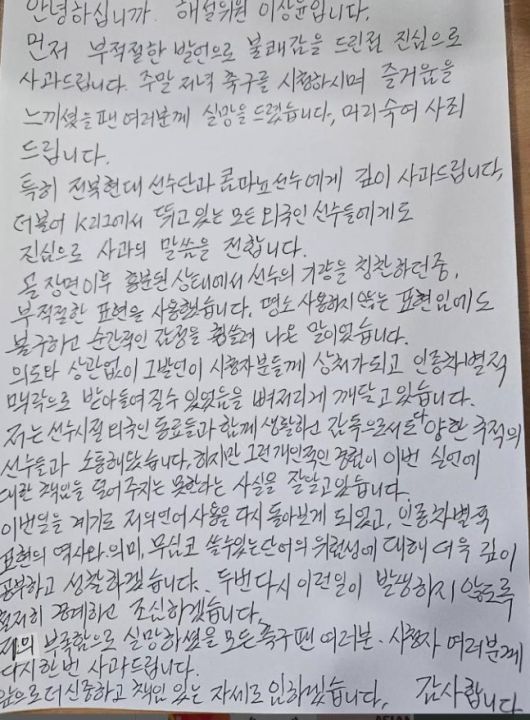 이 위원은 사과문에 “특히 전북 현대 선수단과 콤파뇨 선수에게 깊이 사과드린다”면서 “더불어 K리그에서 뛰고 있는 모든 외국인 선수들에게도 진심으로 사과의 말씀을 전한다”고 썼다.