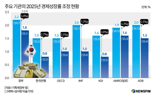 이밖에 다른 기관들도 ▲아시아개발은행(ADB) 2.0%→1.5% ▲아세안+3 거시경제조사기구(암로·AMRO) 1.9%→1.6% ▲한국은행 1.5%→0.8% 등 연이은 하향 조정에 나섰다. 특히 KDI와 한은 등은 기존 1%대에서 0%대로 크게 내려 잡았다.