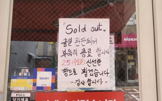 "금일 완판되어 부득이하게 종료합니다."지난 24일 오후 3시께 찾은 서울 강서구 화곡역 인근의 '1000원 빵집'은 늦은 점심시간임에도 이미 영업을 마친 상태였다. 출입문에는 'Sold out(매진)' 안내문이 붙어 있었고, 이를 확인한 몇몇 손님은 아쉬운 표정으로 발길을 돌렸다. 이곳은 단팥빵, 소보로빵 등 28가지 품목 대다수를 1000원에 판매해 입소문을 탔다. 가장 비싼 품목인 호밀 식빵도 3500원에 불과해 다른 빵집들과 비교해 가격 경쟁력이 높다.