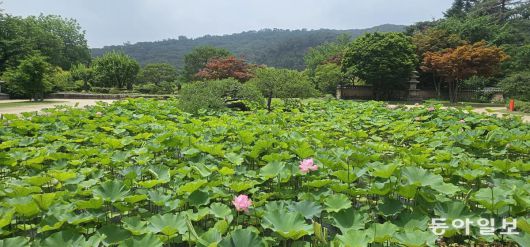 장 미셸 오토니엘의 작품 ‘황금 장미’와 ‘황금 목걸이’가 설치돼 있는 관음정 앞 연못에 노랑어리연꽃이 가득 피었다. 용인=김선미 기자 kimsunmi@donga.com |