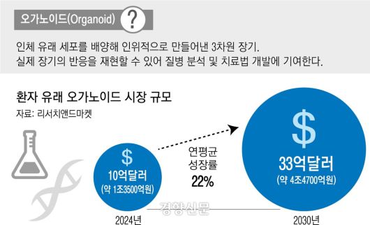 미국이 주도하는 오가노이드 산업은 규모가 더 커질 것으로 전망된다. 미국 FDA는 지난 4월 약물 개발을 위한 동물실험의 단계적 폐지를 공식화하면서 기존의 동물실험을 오가노이드로 대체할 수 있도록 한다고 발표했다. 인간과 생물학적 차이가 있는 동물 대신 오가노이드를 활용하면 인간 생체 반응을 더 잘 예측할 수 있고, 연구·개발 비용도 줄일 수 있어 ‘공중보건과 생명윤리 모두에 이익’이라는 취지다. 시장조사기관 리서치앤드마켓은 환자 유래 오가노이드 시장 규모가 지난해 10억달러(약 1조3500억원)에서 2030년 33억달러(약 4조4700억원)로 연평균 22% 성장할 것으로 추산했다.