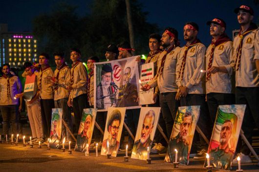 28일(현지시각) 바그다드 주재 이란 대사관 앞에서 열린 추모 행사에서 레바논 헤즈볼라와 이란 혁명수비대(IRGC) 사망 지도자들의 사진 뒤에 정찰대(스카우트) 단원들이 서 있다. 이번 행사는 최근 이스라엘의 공습으로 사망한 혁명수비대 요원들과 과학자들을 추모하기 위해 열렸다. 바그다드/AFP 연합뉴스 |