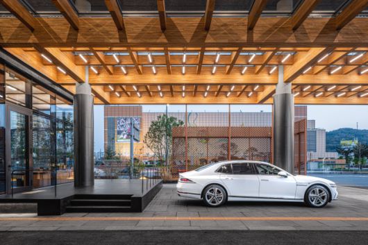 지난 4월 문을 연 제네시스 청주는 건물 외관부터 시선을 잡아끌며 호기심을 자극한다. 건물은 지하 2층~지상 6층, 연면적 6953㎡로 지어져 제네시스 전시장 가운데 최대 규모를 자랑한다. 세계적인 공예 도시인 충북 청주시에 자리한 만큼 한국적인 아름다움을 최대한 살리고자 한 노력도 돋보인다. 건물 곳곳에는 한지와 나무 등 한국 미감을 극대화한 재료를 사용했는데 1층에 길게 뻗는 나무 캐노피(길이 60m, 높이 5m)는 한옥의 처마를 연상하게 했다. 이곳은 제네시스 청주를 찾은 고객을 맞이하고 배웅하며 손님 응대의 시작과 끝을 책임진다.