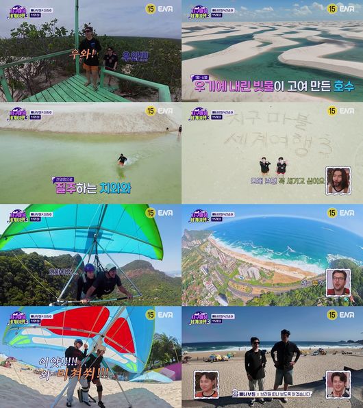 빠니보틀과 신승호는 브라질 렌소이스 국립공원을 찾았다. 울창한 숲을 지나자 신비로운 사구(모래언덕)와 우기에 내린 빗물이 고여 만들어진 옥빛 호수가 말문이 막힐 정도로 비현실적 장관을 펼쳐냈다. 출발 전부터 이 곳을 버킷 리스트로 꼽았던 빠니보틀은 “별의 별 곳 다 가봤다는 자부심이 있었는데, 아직 한참 멀었다는 걸 느낀다”는 감격 후기를 남기기도 했다. 그리고 그 감동은 브라질 하늘 위에서 한층 더 깊어졌다. 두 사람은 리우데자네이루로 이동, 마지막 하이라이트 액티비티, 행글라이딩에 도전했다. 하늘을 날아오르자 눈 아래 펼쳐진 찬란하고 광활한 자연은 마치 마법과도 같은 순간을 선사했고, 신승호는 “정말로 감사함을 느낀다”며 결국 눈물을 흘렸다. 이로써 ‘크레이지 월드’ 미션 6개를 클리어하며 제작진도 놀라게 만든 ‘미친자들’은 액티비티의 미친 아찔함을 온몸으로 즐겼고, 동시에 대자연 앞에 겸손과 감사를 느끼며, 그 마지막을 감동으로 채웠다.