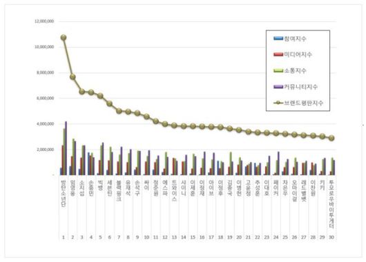 한국기업평판연구소는 지난달 29일부터 이날까지 측정한 스타 브랜드 빅데이터 288,109,312개를 소비자 행동분석을 통해 스타 브랜드에 대한 참여지수, 미디어지수, 소통지수, 커뮤니티지수를 측정했다. 지난 5월 스타 브랜드 빅데이터 272,723,916개와 비교하면 5.64% 증가했다.
