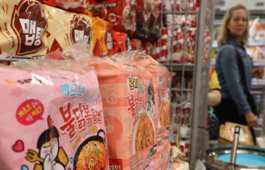 서울의 한 대형마트 라면 판매대에 진열된 삼양식품 불닭볶음면 |