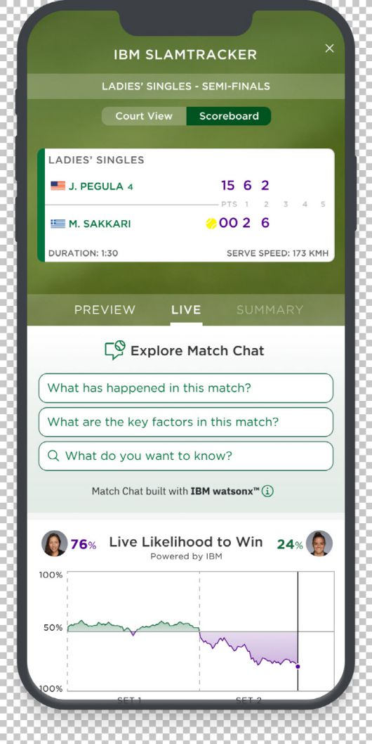 29일 IBM과 윔블던 주관사인 올잉글랜드클럽(AELTC)은 올해 대회에 맞춰 ▲AI 챗봇 ‘매치 챗(Match Chat)’ ▲강화된 ‘승률 예측(Likelihood to Win)’ 기능 등을 공개했다.